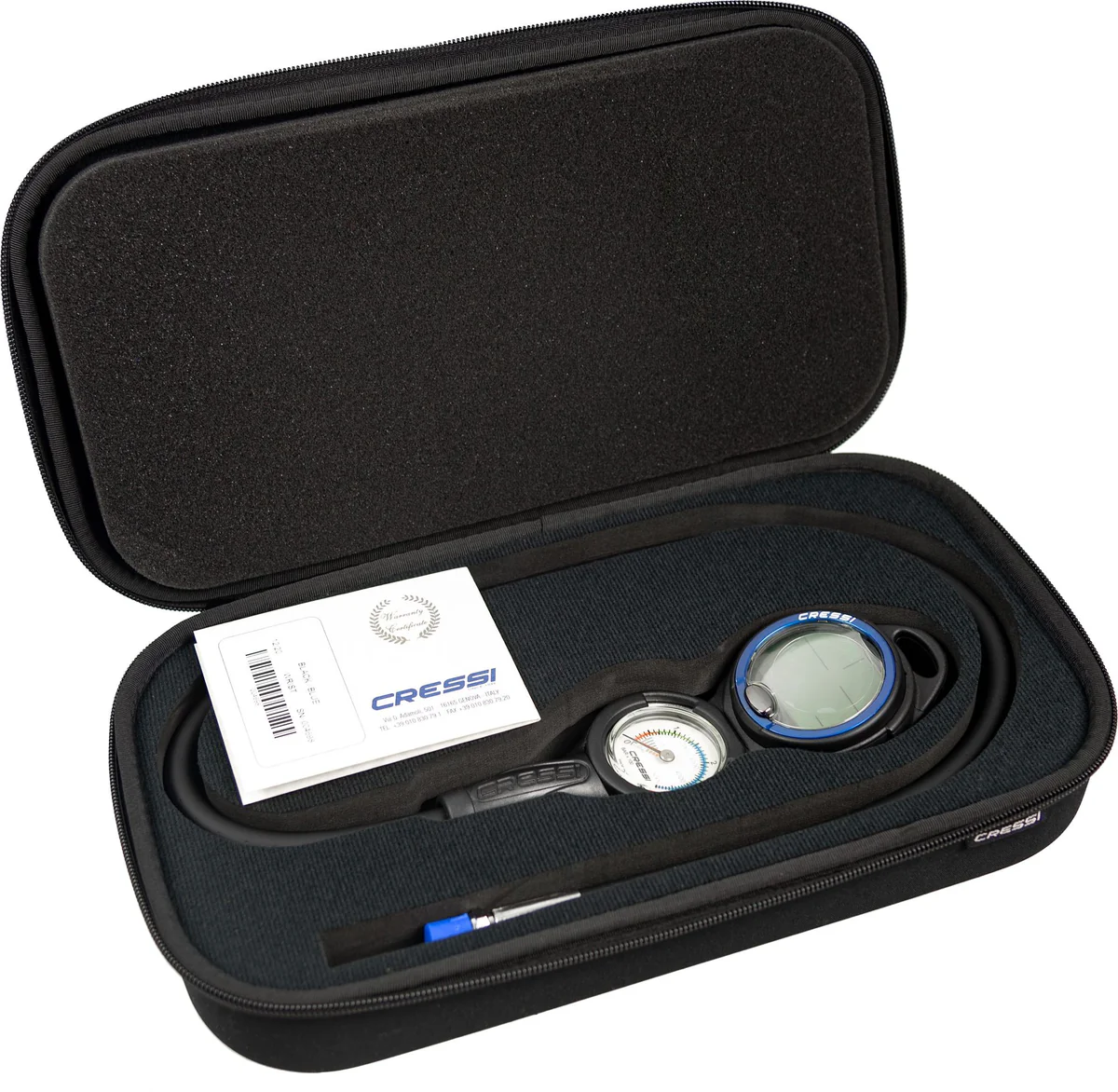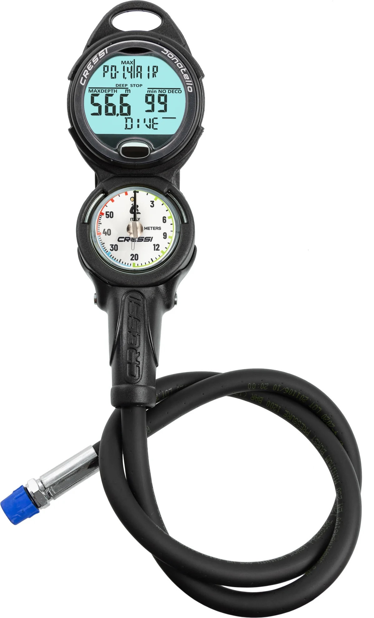 Donatello 2 Console từ Cressi là bộ máy tính lặn + đồng hồ đo áp suất (SPG) mang thiết kế hiện đại, nhẹ nhàng nhưng cực kỳ mạnh mẽ và đáng tin cậy. Màn hình rộng UFDS được bố trí hơi nghiêng giúp nhìn rõ thông số trong mọi góc độ; vỏ được làm từ polycarbonate và Desmopan siêu bền giúp giảm độ dày và trọng lượng, đồng thời tăng tính linh hoạt cho kết nối ống áp suất. Bộ máy hỗ trợ đầy đủ các chế độ lặn: Air, Nitrox, Gauge và Freedive, tích hợp thuật toán RGBM + Deep Stop để đảm bảo an toàn khi lặn sâu. Đồng hồ đo áp suất có vỏ đồng thau mạ chrome, mặt số phát quang, tương thích hệ đo mét và imperial, giúp bạn dễ dàng kiểm tra áp suất nhanh chóng. Trọng lượng cả bộ chỉ khoảng 395 g, kích thước 65 × 25 mm lý tưởng cho thợ lặn chuyên nghiệp lẫn người mới bắt đầu muốn trang bị thiết bị tin cậy, sử dụng được lâu dài.