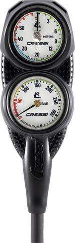 Cressi DP2 Vale 300 C Console là thiết bị đo chuyên dụng kết hợp giữa đồng hồ đo độ sâu và đồng hồ đo áp suất, phù hợp cho cả thợ lặn chuyên nghiệp lẫn người chơi thể thao dưới nước bán chuyên. Đồng hồ đo áp suất có khả năng đọc lên tới 350 bar, với các vùng màu đỏ – xanh – xanh dương giúp phân biệt rõ ràng, đảm bảo đọc nhanh chóng và chính xác. Đồng hồ đo độ sâu được thiết kế tinh tế với mặt hiển thị phát sáng, dễ đọc trong điều kiện thiếu sáng, cùng chỉ báo độ sâu tối đa và thang đo đến 70 mét. Đặc biệt, các vạch chia chi tiết trong khoảng 12 mét đầu tiên rất hữu ích cho các điểm dừng an toàn khi lặn. Vỏ ngoài bằng cao su cứng cáp, chống trượt, có hai vòng kết nối linh hoạt để gắn vào thiết bị khác. DP2 Vale 300 C là một công cụ không thể thiếu trong bộ đồ nghề lặn biển chuyên nghiệp.