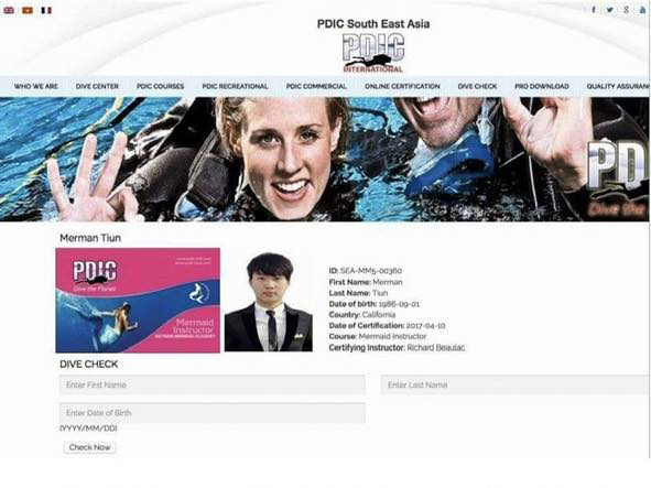 Năm 2017 tôi nhờ thầy dạy lặn bình khí thở Nguyễn Văn Lộc giúp mình học lấy bằng PDIC mermaid instructor. Vậy là tôi đã gặp người thầy tiên cá đầu tiên Richard Beaulac. Trong vòng 1 năm tôi đã dạy cấp bằng cho hơn 100 học sinh nhí học làm tiên cá của PDIC. Tôi cũng tiếp tục viết thư cho SSI và PADI khoe những gì tôi có được nhờ dạy tiên cá và mong họ sớm có chương trình mermaiding ở Việt Nam. Bởi vì lúc này trên thế giới chỉ có tôi là thầy tiên cá duy nhất có bằng chứng nhận của tổ chức uy tín PDIC (Tập đoàn Huấn luyện viên Lặn Chuyên nghiệp là một tổ chức đào tạo và cấp chứng chỉ lặn biển quốc tế. Ước tính có khoảng 5 triệu thợ lặn giải trí đang hoạt động. Được thành lập vào năm 1969, PDIC được thành lập nhằm đáp ứng nhu cầu đào tạo huấn luyện viên lặn biển chuyên nghiệp.)