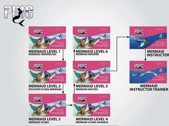 Chương trình thầy tiên cá PADI có 4 level học bắt buộc để lên thầy tiên cá, Mermaid Instructor là thầy tiên cá cao nhất có thể dạy được trong hồ bơi lẫn ngoài biển, thầy tiên cá căn bản Basic Mermaid Instructor chỉ dạy được trong hồ bơi tới level 3 và trợ lý thầy tiên cá Mermaid Instructor Trainer chỉ dạy được trong hồ bơi level 1 và 2.