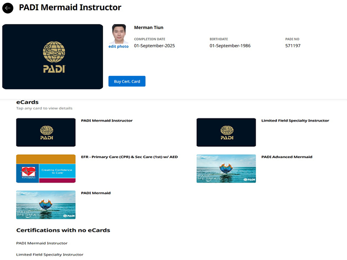 Do thầy tiên cá PADI là chứng chỉ cao nhất thế giới mà ở Việt Nam chưa ai có được, nên những người học làm thầy lặn tự do phải xin bằng để dạy chương trình PADI Mermaid nhưng họ vẫn thua Tiun 1 bậc về chứng chỉ tiên cá, chỉ đạt tới trình độ Limited Field Specialty Instructor và không được công nhận là PADI Mermaid Instructor vì chưa qua đào tạo tiên cá chuyên nghiệp bài bản. Thế nên Tiun chính là người đầu tiên và duy nhất của Việt Nam lấy được bằng huấn luyện viên này từ Mermaid Suki nhân viên giám sát huấn luyện PADI Thái Bình Dương, là 1 bậc thầy về tiên cá của tổ chức này. Luôn chọn những người thầy giỏi nhất để học nhằm tăng thêm thử thách bản thân là sở thích của tôi.