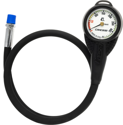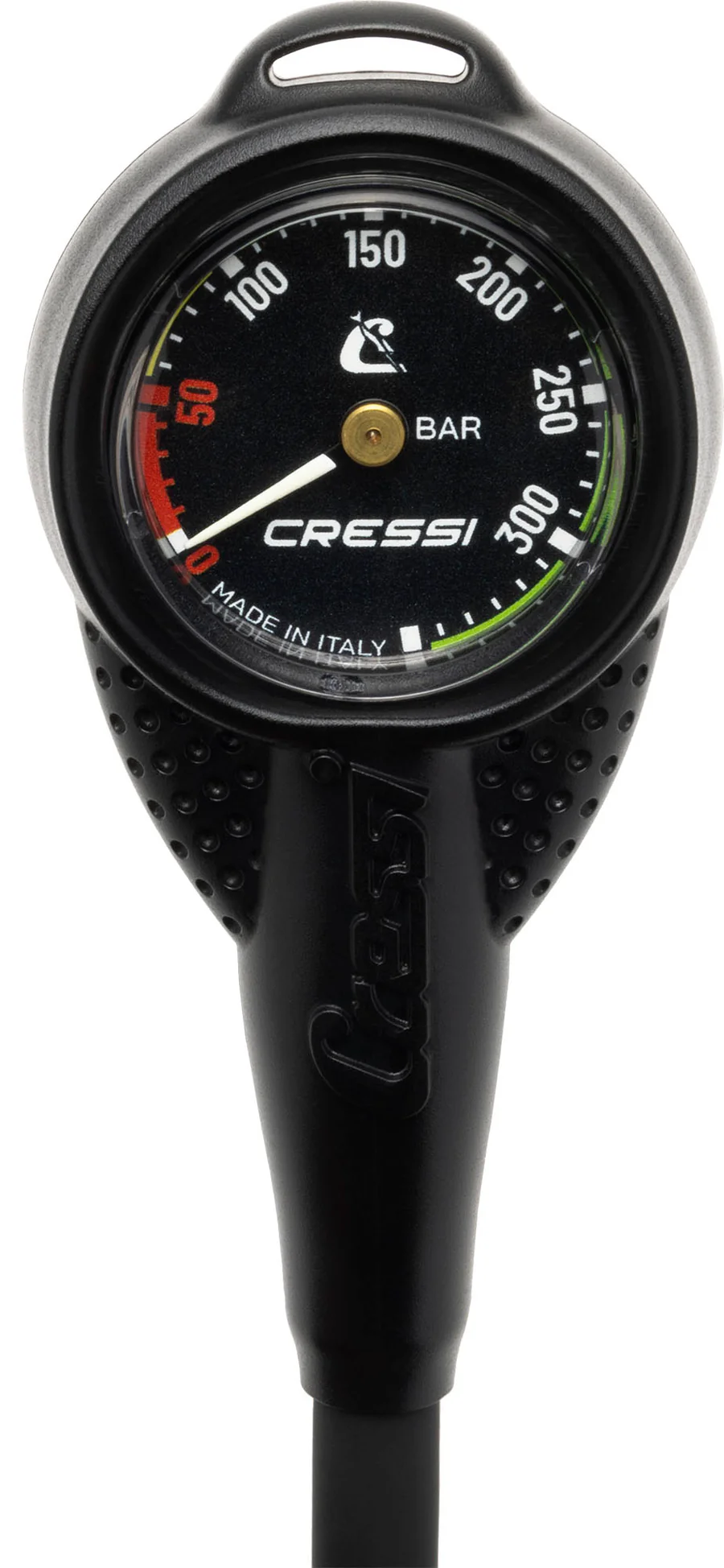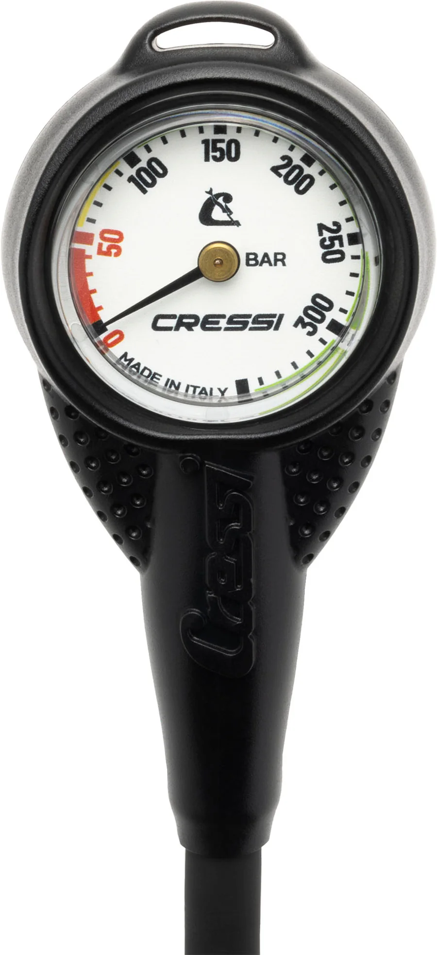 Cressi Mini SPG Vale 300 C Console là thiết bị đo áp suất đơn, thiết kế nhỏ gọn, bền bỉ – lý tưởng cho những thợ lặn muốn tối giản hóa bộ thiết bị mà vẫn đảm bảo theo dõi lượng khí trong bình một cách an toàn. Đồng hồ có khả năng đo áp suất lên đến 350 bar, với mặt hiển thị phân chia 3 vùng màu rõ ràng: đỏ (nguy hiểm), vàng (cảnh báo), xanh lá (an toàn), giúp người lặn nhận biết tức thì tình trạng khí. Vỏ ngoài bằng đồng mạ crôm chắc chắn, chống ăn mòn, tích hợp trong lớp bọc cao su chống trượt và chịu va đập. Vòng kết nối ở đỉnh giúp dễ dàng gắn với dây đeo hoặc bungee. Đây là một trong những mẫu SPG đáng tin cậy, thích hợp cho mọi cấp độ lặn.