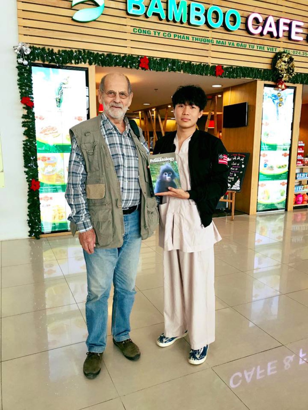 Tiến sĩ Tilo Nalder tổng giám đốc trung tâm cứu hộ linh trưởng nguy cấp vườn quốc gia Cúc Phương tặng sách bảo tồn voọc tạm biệt Tiun ở sân bay Nội Bài