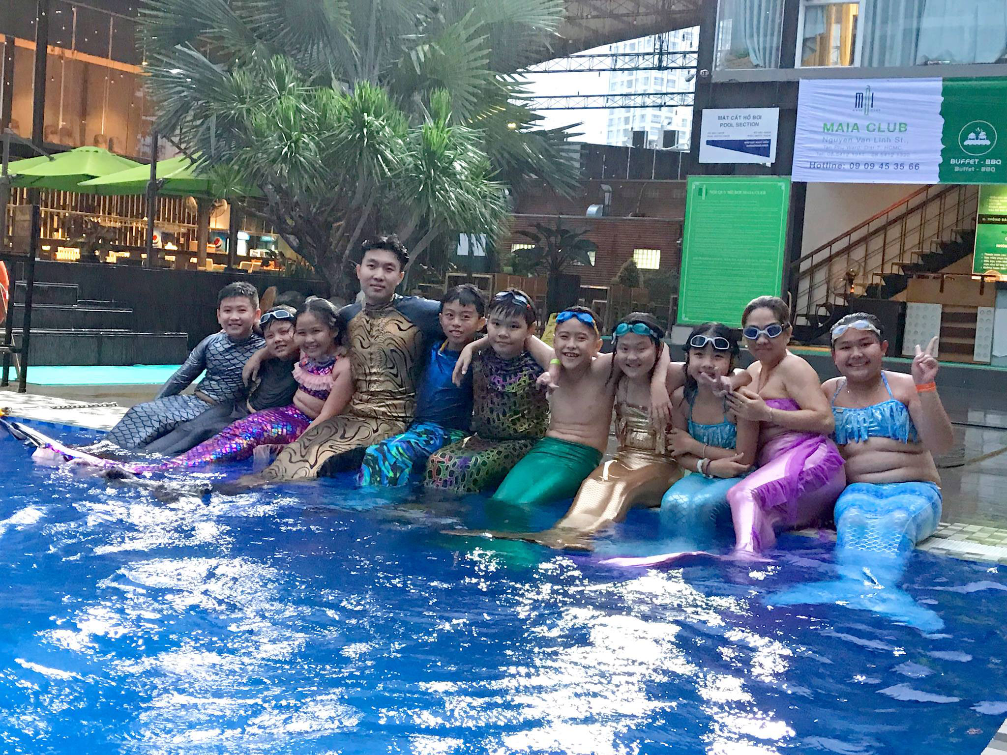 Thầy Tiun dạy bơi cho các học viên người cá tại hồ bơi Marina quận 7