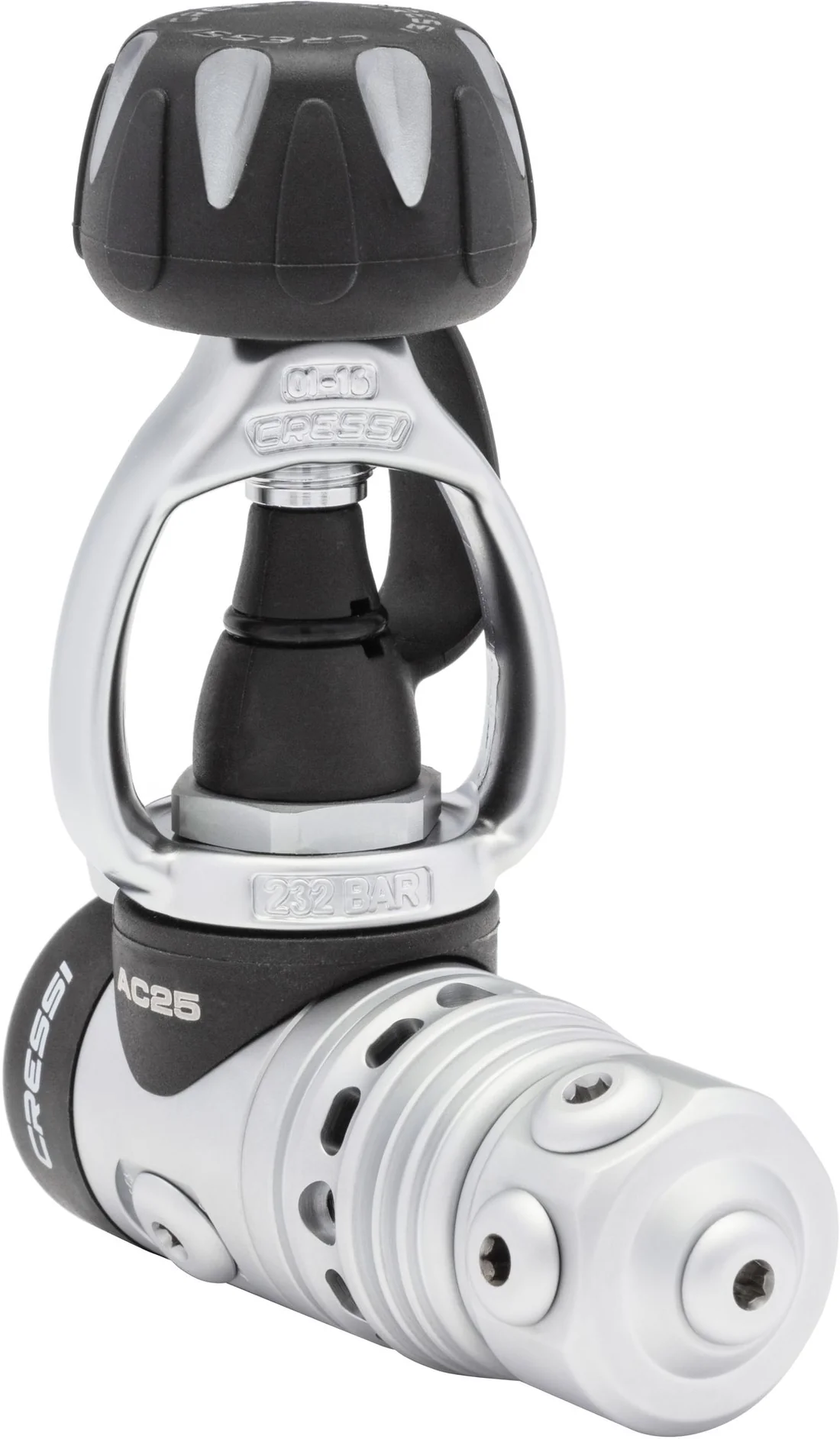 Cressi AC25M 1st Stage là mẫu đầu điều áp cao cấp nhất trong dòng piston của Cressi, sử dụng thiết kế piston cân bằng với cụm xoay 360° (Revolving Turret Balanced Piston) – mang lại lưu lượng khí ổn định, mạnh mẽ và linh hoạt trong mọi hướng kết nối. Với lớp phủ Gun-Metal Chrome cao cấp, AC25M không chỉ có vẻ ngoài sang trọng mà còn sở hữu khả năng chống ăn mòn vượt trội, đảm bảo độ bền trong thời gian dài dù sử dụng ở môi trường nước mặn khắc nghiệt. Thiết kế đầu xoay giúp người dùng bố trí dây dẫn gọn gàng và hiệu quả hơn, đặc biệt phù hợp với cấu hình lặn chuyên nghiệp, kỹ thuật hoặc side-mount. Hệ thống điều chỉnh áp trung gian (IP Calibration) bên ngoài cho phép tinh chỉnh hiệu suất theo ý muốn một cách dễ dàng và nhanh chóng – không cần tháo rời cụm đầu. Hỗ trợ cả hai chuẩn kết nối DIN 300 bar và INT 232 bar, AC25M là lựa chọn hàng đầu cho những ai đang tìm kiếm một đầu điều áp có hiệu năng cao, độ bền cực tốt và khả năng tùy chỉnh linh hoạt.